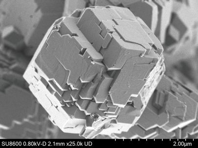 0.8 kV电压条件下观察RHO型沸石的实例。左图为颗粒整体的形貌,右图为放大图像,颗粒表面细微的台阶结构清晰可见。低电压观察对于减少电子束损伤和获取表面形状信息较为有效。